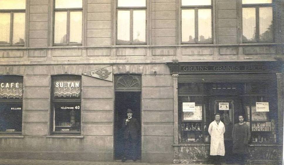 De viswinkel, met op de foto onder andere Eugenietje van de sneukelwinkel, bakker Frans Bonduelle en dochter Godelieve van de viswinkel (jaren ’30).