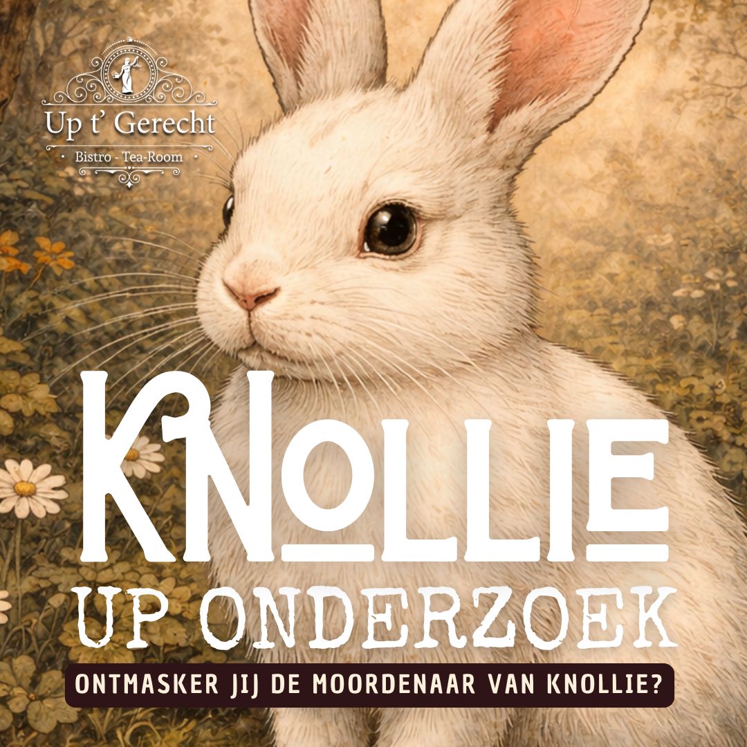 👂 Luister & Speur mee! Tijdens de maand april 2026 kan je in Bistro-Tearoom Up t’Gerecht het leuke luisterspel Up Onderzoek – Knollie beluisteren. Laat je meeslepen in het mysterie en speur mee naar de dader!